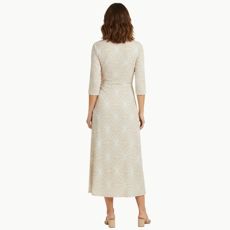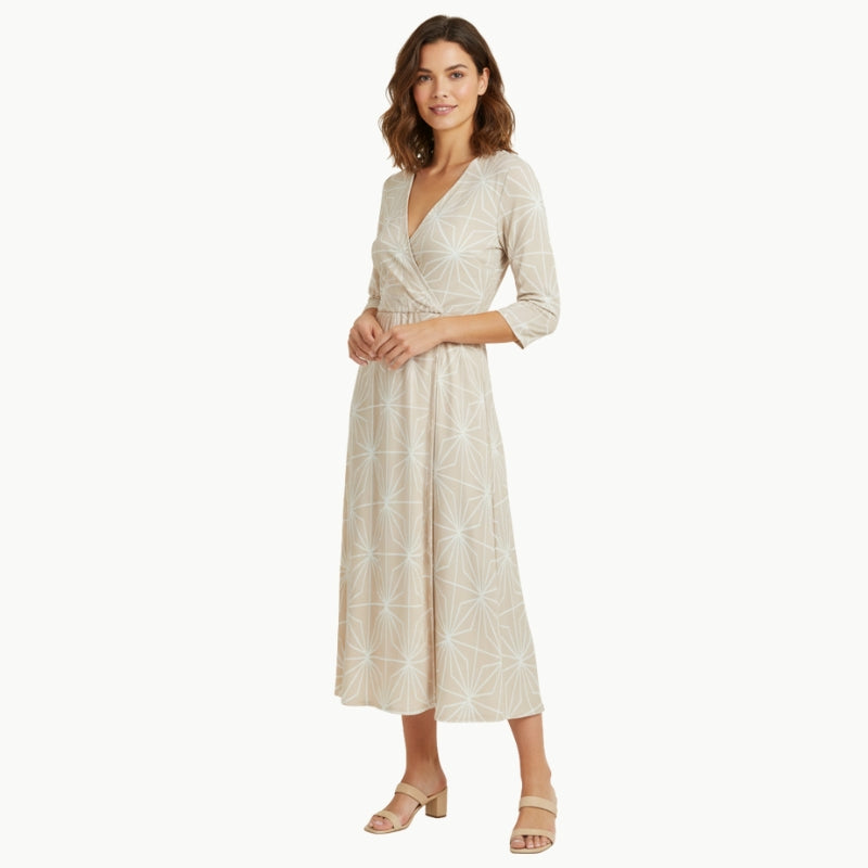 - Mid-length sleeves, V-neck, below-the-knee length, gathered waist