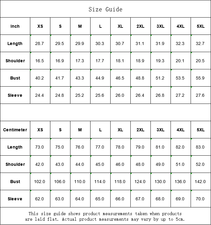 | Inch | XS | S | M | L | XL | 2XL | 3XL | 4XL | 5XL |